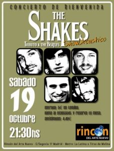 THE SHAKES: 1998. Buenos Aires, Argentina. Allí comenzó todo… Allí fue donde THE SHAKES da sus primeros pasos como banda tributo a The Beatles. Con más de 15 años de trayectoria y cientos de conciertos, llegan a Madrid donde inician su gira Europea, para hacernos revivir los mejores éxitos de la fabulosa banda de Liverpool